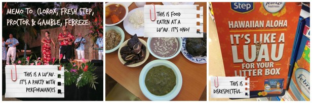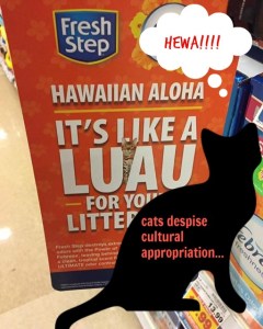 Would the executives at these companies have approved a product called “Mazeltov Cat Litter,” with the slogan “it’s like a Bar Mitzvah in your litter box?” Or “Burrito Cat Litter -it’s like a Fiesta in your litter box?” No. Of course not. Unthinkable. And I apologize for even having to use such offensive examples in order to make a point. But really, can someone please tell me why the Hawaiians and their culture are somehow exempt from consideration, why they are considered fair game?