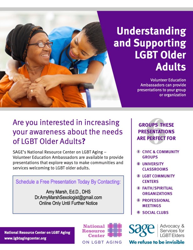 I have just been accepted as a “Volunteer Education Ambassador” through the SAGE National Resource Center on LGBT Aging and am available to present their program materials to community organizations (online at present).
