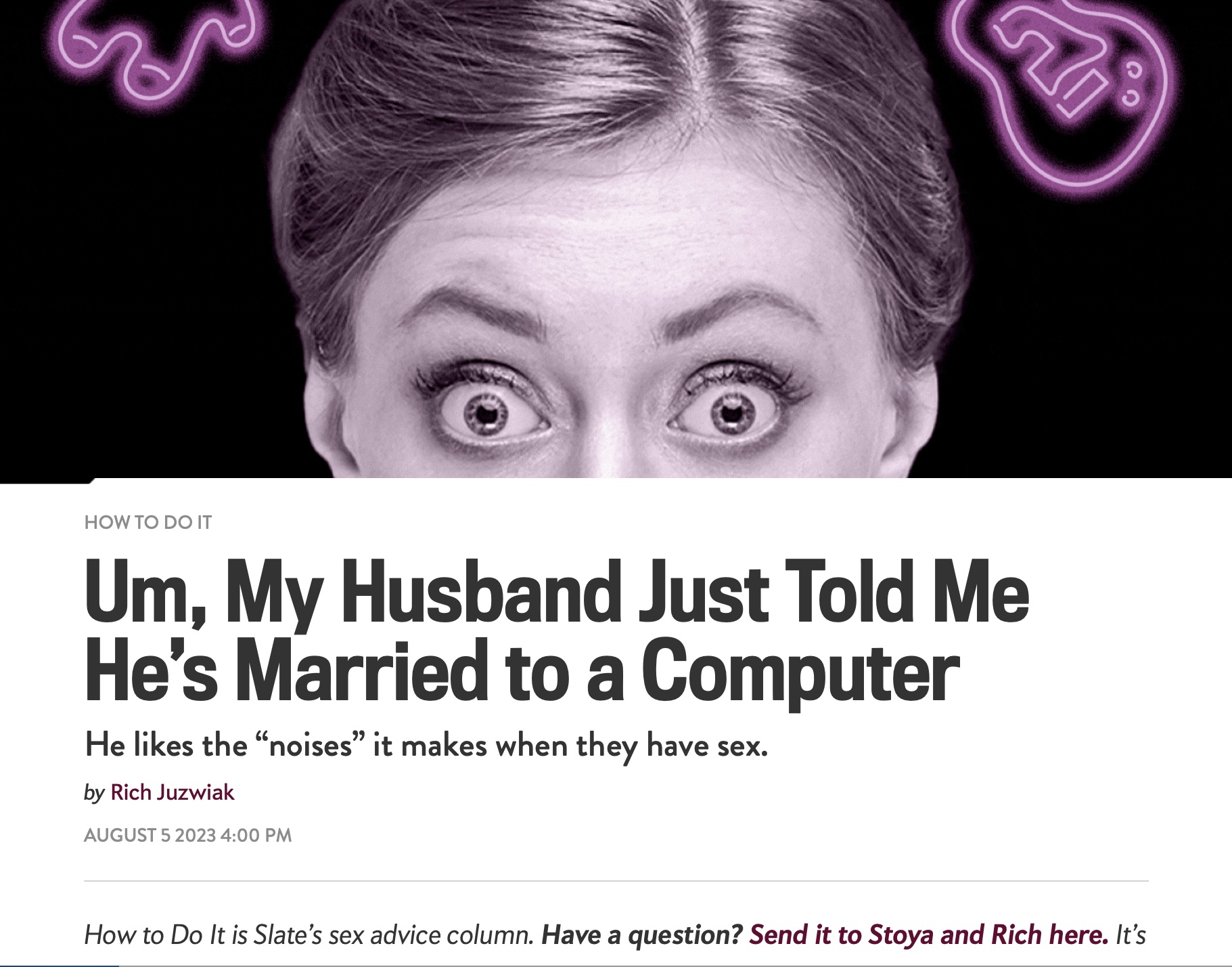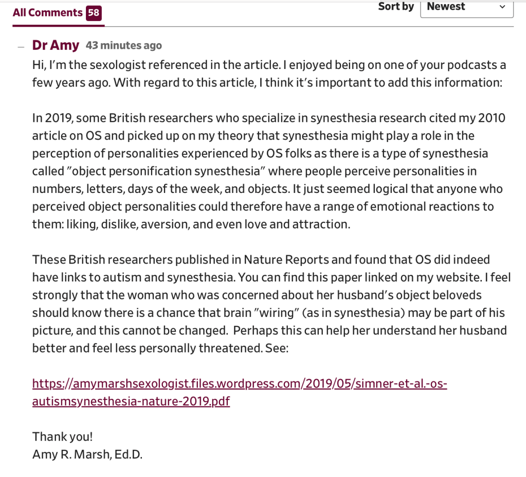 I did feel the need to point out in the comments that research published in 2019 (Nature Reports) showed that there is indeed a link between synesthesia and autism with objectum sexuality and I wish this had been referenced in Juzwiak’s response, as the idea that object personification synesthesia could be a factor might help the wife understand her husband’s relationships to his beloved objects.