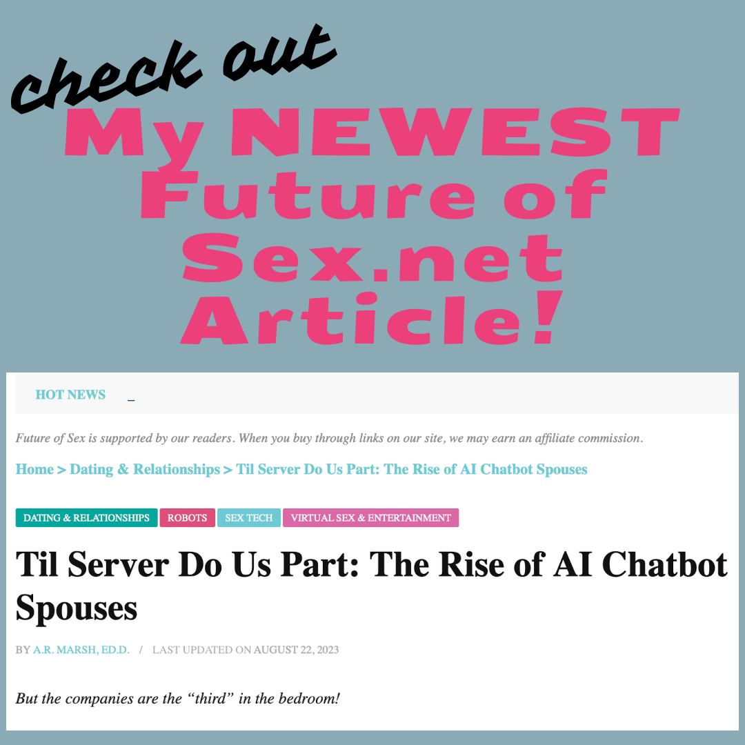 I’m extremely pleased to be writing now for FutureofSex.net! My first article, “Til Server Do Us Part:” The Rise of AI Chatbot Spouses, was published yesterday (8/20/23) and concerns a topic that has become near and dear to my heart: erotic AI chatbot companions. I hope you read it and begin to follow my articles on this excellent sex tech publication! Thank you!