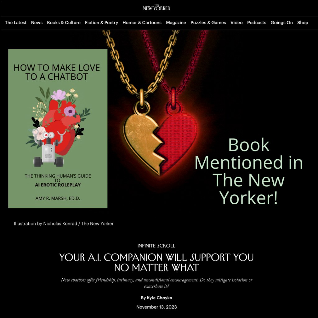 I’m extremely pleased that my book, How To Make Love To A Chatbot: The Thinking Human’s Guide to AI Erotic Roleplay, in this New Yorker article about AI chatbots published Nov. 13th.