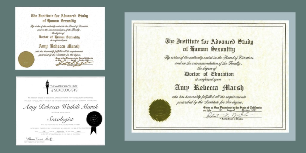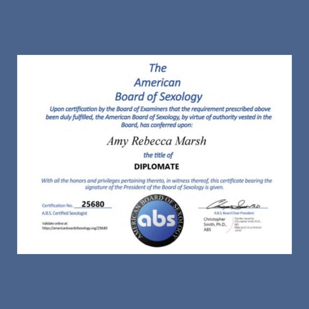 I am a board certified Diplomate of Sexology (ABS), clinical sexologist (Ed.D, DHS), AASECT-certified sexuality counselor (CSC), and certified hypnotist and hypnosis instructor (CH, CI), who has worked in the field of human sexuality since 2008.